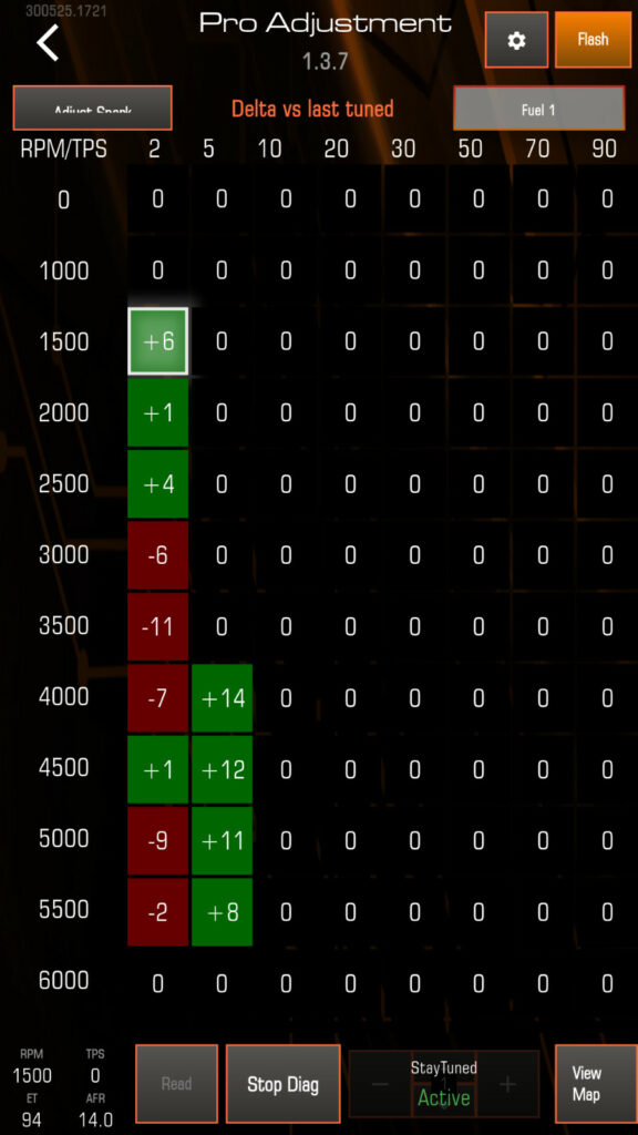 When StayTuned is active and writing to map then the “Pro adjustment” page changes to show the changes being made by StayTuned. In the screenshot below you can see on the “Pro adjustment” page new entries from StayTuned appear as red and green cells, depending on whether fuel has been added or removed. These numbers get adjusted as you ride and whilst they shouldn’t be trusted blindly, can give you a pretty good idea of where you need to be fuelling-wise.